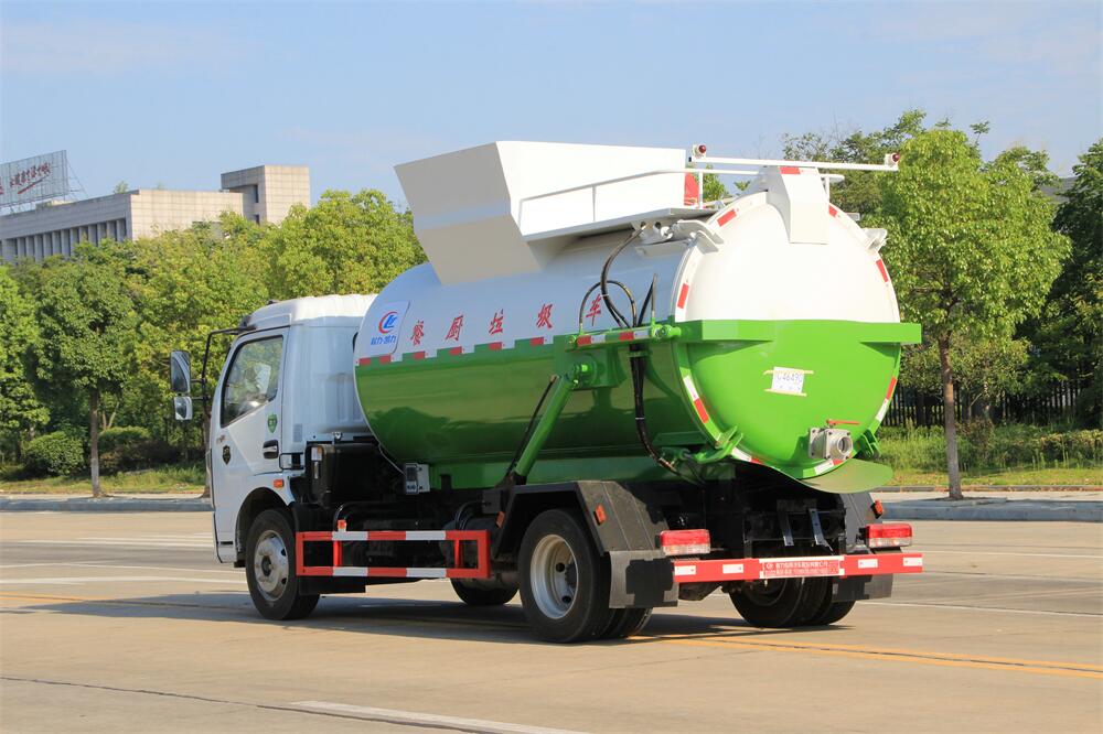 上裝配置:罐體容積8m3,配備120L/240L掛桶提升翻轉機構,液壓系統,后蓋液壓鎖緊開啟,罐體可以舉升自卸,尾部帶自流閥;用于運輸液態垃圾,其特點操作簡單,密封性好,無泄漏,無異味;可選裝固液分離功能,推板擠壓功能,常用于餐館的垃圾轉運處理。