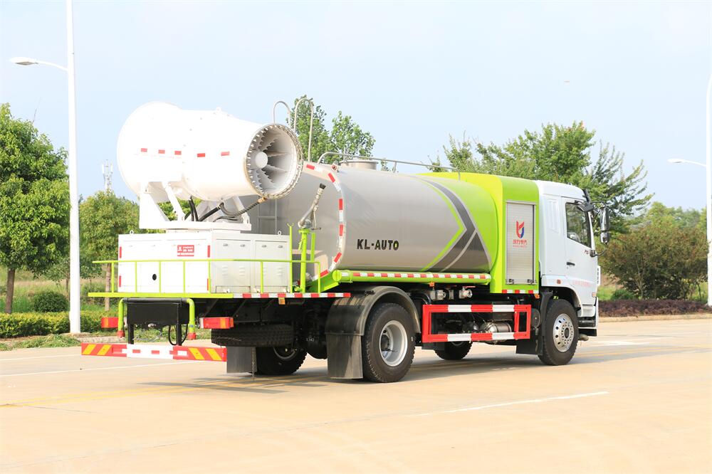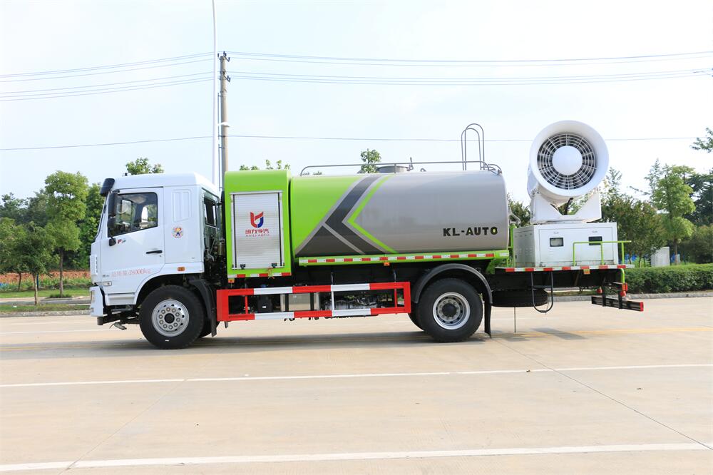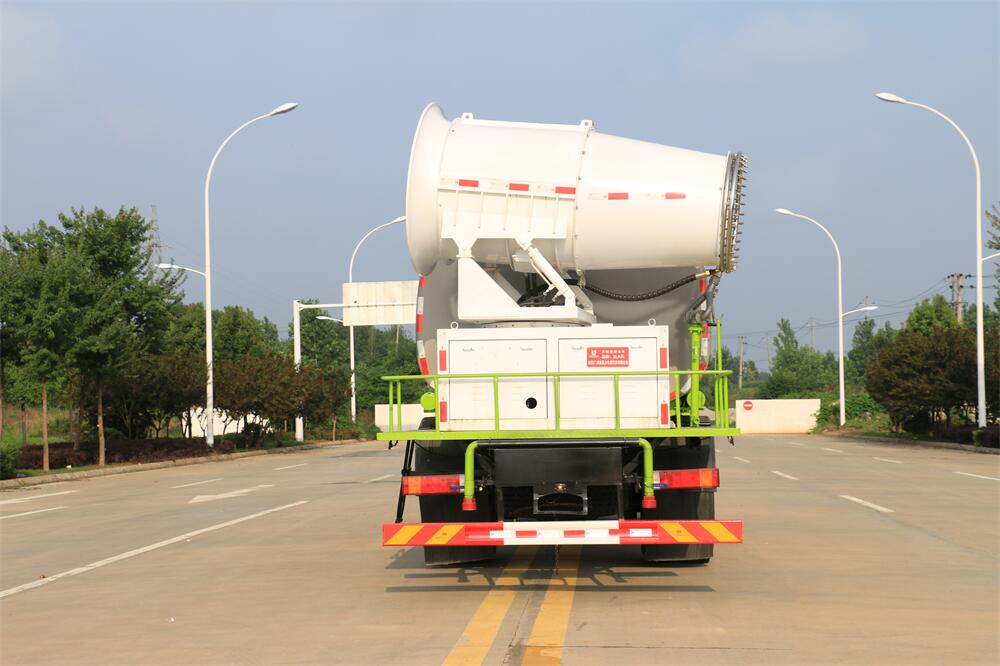 上裝配置:罐體容積為 12立方,選配風送式霧炮機組射程30米、40米、50米、60米、80米、100米、120米霧炮,罐體鋼板為4mm碳鋼Q235材質,罐內隔板具有防波作用,以減輕汽車行駛時罐體液體沖擊,罐體及整車外形尺寸按照公告。帶大功率專用灑水泵,泵可自吸自排,整車前沖、后灑、側噴、帶65消防接口,后平臺配CLW-50、CLW-60、CLW-80、CLW-100、CLW-120型風送式霧炮機組;罐體前封頭配大功率柴油發電機組;前封頭帶水位計,后平臺主管路帶1寸澆花接口,后爬梯。帶兩根輸水管及陰陽端。罐體顏色:銀/灰/綠,罐體兩側噴“多功能抑塵車”字樣,貼反光標示。