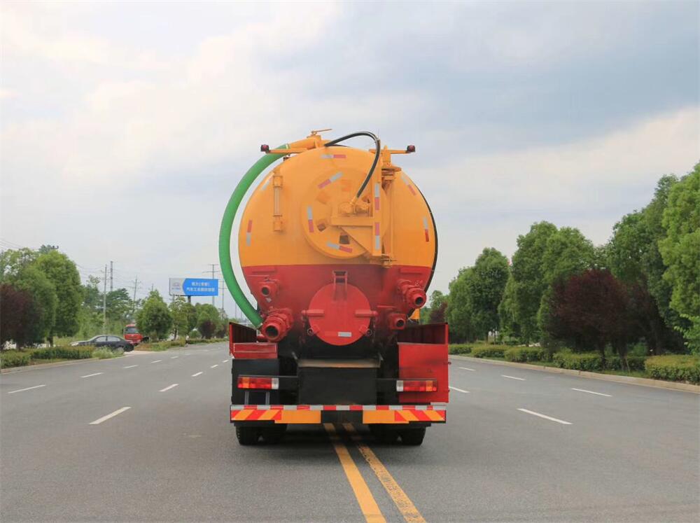 上裝配置:罐體容積為 30 立方(水污可自由 分配),罐體 8mm 厚,封頭 8mm 厚,水罐、污 罐可互通,用 100 球閥**開關;清洗部份采 用雙耀高壓泵,壓力 20Mpa,流量 330L/min, 配 80 米直徑 25 高壓管帶液壓卷盤;吸污部份 采用濰柴420馬力副發動機帶山東SK-42水循 環泵(副發自帶),吸污罐帶舉升,尾部加裝 一個 600mm 快開,罐體后尾部一個 DN150 不銹 鋼排污口,一個 DN150 不銹鋼偷排,兩個 DN100 吸污球閥帶出口盤,一個視污窗,兩根 10m 吸 污管,一套陰陽端,壓力表,防溢閥,箭頭燈, 工具箱,淋管裝置,高壓泵帶氣吹水。配一個 9 公斤水雷噴頭,另帶一個 80 公分手持洗車 噴頭。